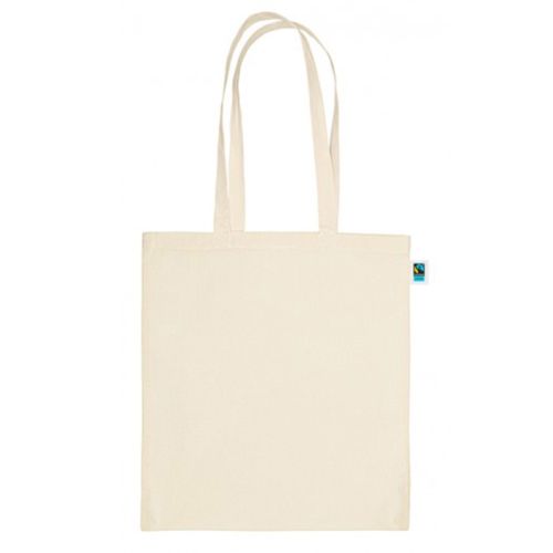 This cotton bag is made of organic cotton. This bag bears the Fairtrade label, which guarantees fair and sustainable production. The bag has long handles and is very sturdy thanks to its cotton thickness of 150 gr/m2. The bag measures 38 x 42 cm and its colour is that of unbleached cotton.