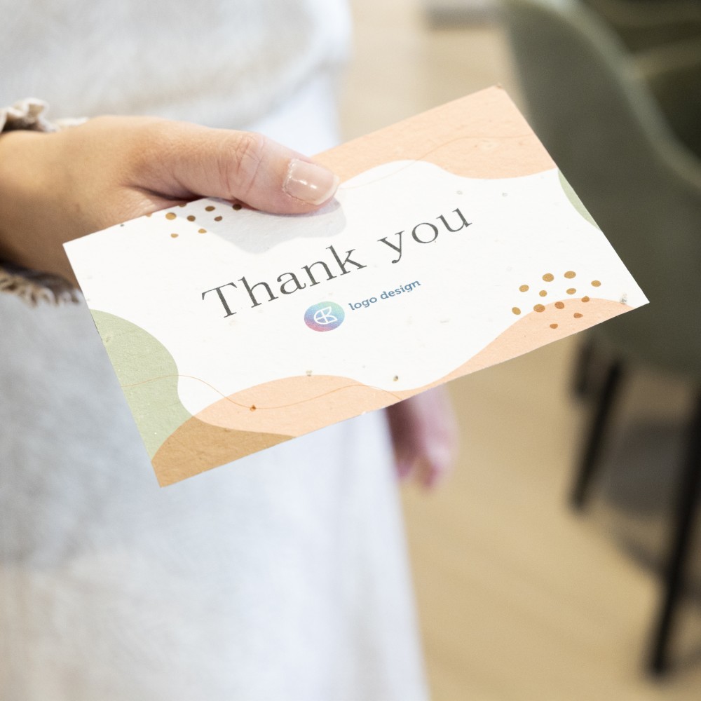 The seed paper cards are very popular as promotional item. You can convey your message in a green way and you surprise people with a very original card. Plantable cards are highly suitable for marketing campaigns and events. All seed paper items can be full colour customised with your own design.